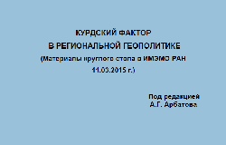 КУРДСКИЙ ФАКТОР В РЕГИОНАЛЬНОЙ ГЕОПОЛИТИКЕ (Материалы круглого стола в 11.03.2015 г.) ИНСТИТУТ МИРОВОЙ ЭКОНОМИКИ И МЕЖДУНАРОДНЫХ ОТНОШЕНИЙ РОССИЙСКОЙ АКАДЕМИИ НАУК Под редакцией: А.Г. Арбатова Москва – 2015 Скачать: КУРДСКИЙ ФАКТОР В РЕГИОНАЛЬНОЙ ГЕОПОЛИТИКЕ * ناوی بابەت: فاکتەری کورد لە جیۆپۆلیتیکی ناوچەیی (بابەتەکانی مێزگەردی ١١ی ئازاری ٢٠١٥ لەلایەن پەیمانگای ئابووری جیهانی و پەیوەندییە نێودەوڵەتییەکان ئەکادیمیای زانستی ڕووسیا) QR Kod: